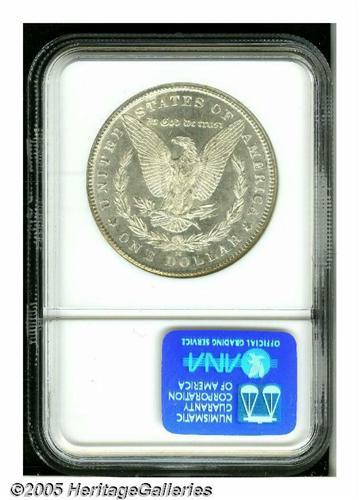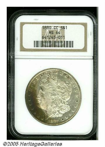 <B>1880-CC<S$1> 8 Over Low 7 MS64 NGC.</B></I> VAM-6. A Top 100 Variety. This mildly prooflike Choice Carson City Dollar has a brilliant reverse and beautiful sea-green, rose, and gold color along the left obverse border.