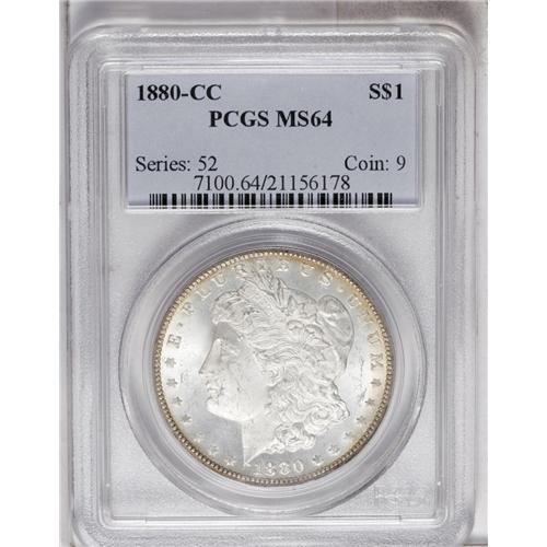 <B>1880-CC<img border='0' src='http://www.heritagecoins.com/images/star.gif' width=10 height=10>$1> 8 Over Low 7 MS64 PCGS.</B></I> VAM-6. A Top 100 Variety. The overdate feature is unmentioned on the PCGS insert. Golden-brown toning enriches the margins of this lustrous and suitably struck CC-mint dollar. Splendidly preserved save for faint grazes on the cheek.