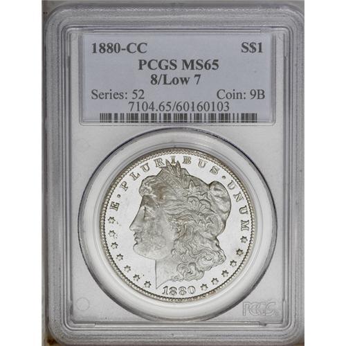 <B>1880-CC<img border='0' src='http://www.heritagecoins.com/images/star.gif' width=10 height=10>$1> 8 Over Low 7 MS65 PCGS.</B></I> VAM-6. A Top 100 Variety. Highly lustrous and brilliant silver surfaces with no evidence of toning on either side. The devices have full mint frost while the fields have satiny luster. Both letters of the mintmark have tiny die chips at their center.