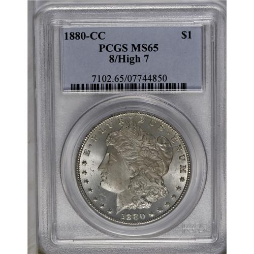 <B>1880-CC<img border='0' src='http://www.heritagecoins.com/images/star.gif' width=10 height=10>$1> 8 Over Low 7 MS65 PCGS.</B></I> VAM-6. A Top 100 Variety. PCGS has incorrectly certified this piece as an 1880-CC 8 Over High 7 (VAM-5). This beautiful Gem has a dusting of original pale gold toning, and benefits from a virtually pristine reverse. Light contact near the chin helps preclude a higher grade.