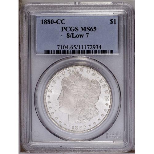 <B>1880-CC<img border='0' src='http://www.heritagecoins.com/images/star.gif' width=10 height=10>$1> 8 Over Low 7 MS65 PCGS.</B></I> VAM-6. A Top 100 Variety. Remains of the low 7 are clearly visible on this lustrous, brilliant, and near-pristine Gem. PCGS has graded 24 examples finer (3/06). <BR><BR><B>Important notice:</B> Heritage usually auctions material at the rate of 200-250 lots per hour. On some occasions eBay Live bid software or the Internet may not be able to keep up with the pace of the auction. We recommend placing a realistic absentee bid now as insurance to avoid disappointment. Occasionally the auctioneer may eliminate or reject an eBay Live bid, and the auctioneer may also reopen a lot after the close of the eBay live bidding (usually because we missed an audience bid), and may reject your bid even if it shows you as the winning bidder. By bidding via eBay Live, you agree that Heritage may award the lot to another bidder at its sole discretion under the circumstances described above or any other reasonable circumstances. Since eBay bids are not shown to us until we open the lot on the floor, we treat those bids just like floor bids. In most cases the floor responds before the eBay bid is presented to us, due to Internet lag time, so for consistency we have made it a policy that floor bids are always considered first over tie eBay live bids. Also please note that all Heritage lots purchased through eBay Live carry a 20% Buyer's Premium. Please make sure you read the Terms and Conditions before you bid. This lot is being auctioned in conjunction with a live floor auction by Heritage Galleries & Auctioneers. All final auction and invoice information will be supplied by Heritage Galleries & Auctioneers, and all other information should be considered preliminary. Lot:3275 <BR><BR><B>Winning Notification and Billing:</B> After the FINAL session in this auction is complete, Heritage will send e-mail and snail mail invoices. This process normally takes several days. All final auction and invoice information will be supplied by Heritage Galleries & Auctioneers, and all other information should be considered preliminary. <BR><BR>This auction will be conducted on a live auction floor and over the Internet through eBay Live. If you choose to place an absentee bid, please take a moment to <font color='#0000ff'><u><a href='http://pages.ebay.com/liveauctions/help/before/laabsentee.html'>learn how eBay Live absentee bidding works</a></u></font><font color='#000000'>