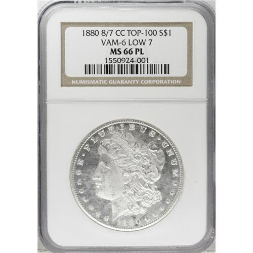 <B>1880-CC S$1 8 Over Low 7 MS66 Prooflike NGC.</B></I> VAM-6. A Top 100 Variety. This brilliant Premium Gem has frosty devices and prominently mirrored fields. The central strike is above average for the issue. The 1880-CC is the source of the three most obvious overdates in the Morgan dollar series, VAMs 4, 5, and 6. Census: 2 in 66 Prooflike, 0 finer (1/07).<BR><BR><b>Shipping:</b> Coins & Currency (<a target="_blank" href="http://www.heritageauctions.com/common/shipping.php">view shipping information</a>)