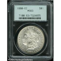1880-CC S$1 MS63 PCGS. Untoned and well struck wit <B>1880-CC S$1 MS63 PCGS.</B></I> Untoned and well struck with smooth, lustrous surfaces. Minimally abraded for a CC Dollar. <BR><BR><B>Important notice:</B> Heritage usually auctions material at the rate of 200-250 lots per hour. On some occasions eBay Live bid software or the Internet may not be able to keep up with the pace of the auction. We recommend placing a realistic absentee bid now as insurance to avoid disappointment. Occasionally the auctioneer may eliminate or reject an eBay Live bid, and the auctioneer may also reopen a lot after the close of the eBay live bidding (usually because we missed an audience bid), and may reject your bid even if it shows you as the winning bidder. By bidding via eBay Live, you agree that Heritage may award the lot to another bidder at its sole discretion under the circumstances described above or any other reasonable circumstances. Since eBay bids are not shown to us until we open the lot on the floor, we treat those bids just like floor bids. In most cases the floor responds before the eBay bid is presented to us, due to Internet lag time, so for consistency we have made it a policy that floor bids are always considered first over tie eBay live bids. Also please note that all Heritage lots purchased through eBay Live carry a 20% Buyer's Premium. Please make sure you read the Terms and Conditions before you bid. This lot is being auctioned in conjunction with a live floor auction by Heritage Galleries & Auctioneers. All final auction and invoice information will be supplied by Heritage Galleries & Auctioneers, and all other information should be considered preliminary. Lot:7342