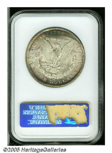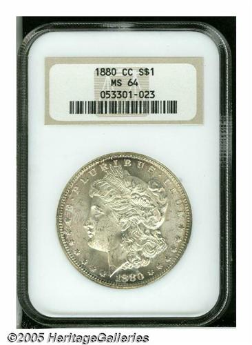 <B>1880-CC<S$1> MS64 NGC.</B></I> Sharply struck and highly lustrous, with dappled champagne toning on the obverse, a crescent of rainbow color along the upper reverse, a single noteworthy abrasion on the eagle's breast, and minor scuffiness on Liberty's face and neck. A nice near-Gem.