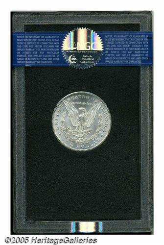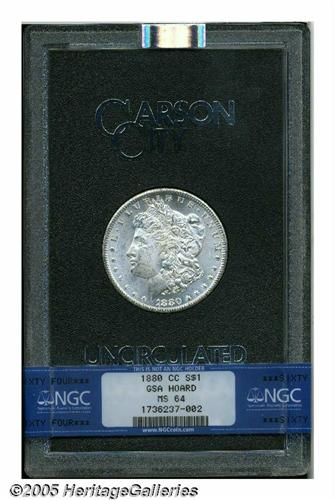 <B>1880-CC<S$1> MS64 NGC.</B></I> Traces of gold color visit this lustrous and typically struck scarce date Carson City Dollar. The reverse is well preserved, and the obverse has only light grazes. Accompanied by the box and certificate of issue.
