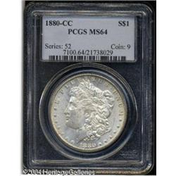1880-CC S$1 MS64 PCGS. Light cream-gray and aprico <B>1880-CC S$1 MS64 PCGS.</B></I> Light cream-gray and apricot patina. A lustrous and suitably struck representative of this scarce Carson City issue. A small rim nick at 5 o'clock on the reverse is barely worthy of mention. <BR><BR><B>Important notice:</B> Heritage usually auctions material at the rate of 200-250 lots per hour. On some occasions eBay Live bid software or the Internet may not be able to keep up with the pace of the auction. We recommend placing a realistic absentee bid now as insurance to avoid disappointment. Occasionally the auctioneer may eliminate or reject an eBay Live bid, and the auctioneer may also reopen a lot after the close of the eBay live bidding (usually because we missed an audience bid), and may reject your bid even if it shows you as the winning bidder. By bidding via eBay Live, you agree that Heritage may award the lot to another bidder at its sole discretion under the circumstances described above or any other reasonable circumstances. Since eBay bids are not shown to us until we open the lot on the floor, we treat those bids just like floor bids. In most cases the floor responds before the eBay bid is presented to us, due to Internet lag time, so for consistency we have made it a policy that floor bids are always considered first over tie eBay live bids. Also please note that all Heritage lots purchased through eBay Live carry a 20% Buyer's Premium. Please make sure you read the Terms and Conditions before you bid. This lot is being auctioned in conjunction with a live floor auction by Heritage Galleries & Auctioneers. All final auction and invoice information will be supplied by Heritage Galleries & Auctioneers, and all other information should be considered preliminary. Lot:7343
