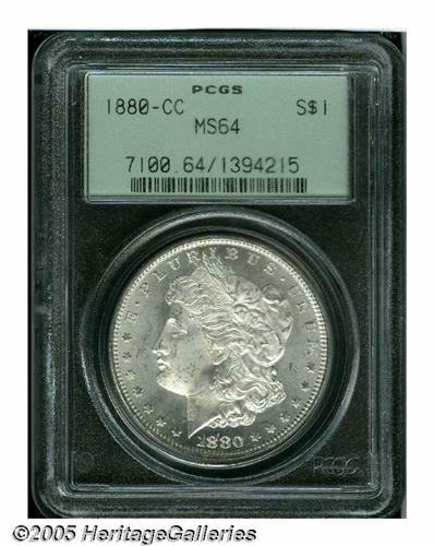 <B>1880-CC<S$1> MS64 PCGS.</B></I> Lustrous, nearly white example. The surfaces have an evenly frosty appearance and, for the grade, and very much free of distractions.