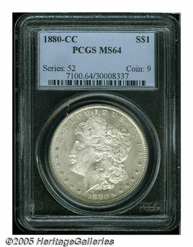 <B>1880-CC<S$1> MS64 PCGS.</B></I> Streaks of light walnut-brown toning confirm the originality of this lustrous and suitably struck better date Carson City Dollar. The reverse is particularly well preserved.