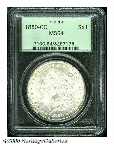 <B>1880-CC<S$1> MS64 PCGS.</B></I> This lustrous older holder near-Gem has a decent strike and pleasing preservation. Faint apricot toning denies full brilliance.<BR><I>From The Stig Ericsson Collection.</B></I>