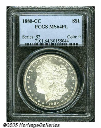 <B>1880-CC<S$1> MS64 Prooflike PCGS.</B></I> Sharply struck with reflective fields and frosted snow-white devices. A seemingly modest number of surface blemishes are evident, for the grade.