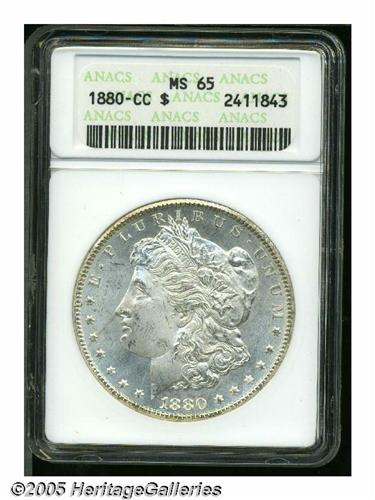 <B>1880-CC<S$1> MS65 ANACS.</B></I> A bright example with nice eye appeal and just a few distinctive bag marks noted on the obverse, wholly in line with the overall condition of this Gem example.