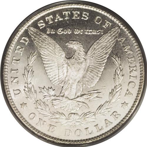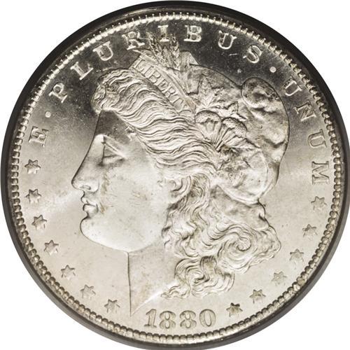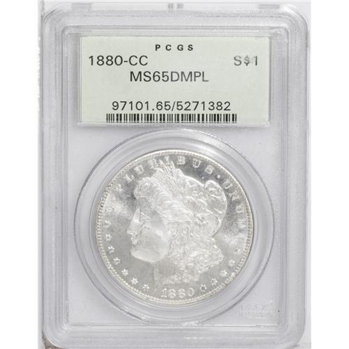 <B>1880-CC<img border='0' src='http://www.heritagecoins.com/images/star.gif' width=10 height=10>$1> MS65 Deep Mirror Prooflike PCGS.</B></I> Brilliant silver-white surfaces with profoundly mirrored fields complement the glacially frosted devices. This piece is well struck and extremely collectible. Certified in a green-label holder. Population: 23 in 65, 3 finer (8/06).