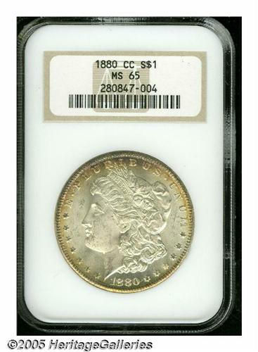 <B>1880-CC<S$1> MS65 NGC.</B></I> Sharply struck and fully brilliant with peripheral gold and iridescent toning. The surfaces have rich, frosty luster.<BR><I>From The Stig Ericsson Collection.</B></I>