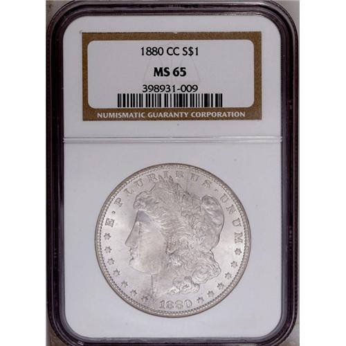 <B>1880-CC<img border='0' src='http://www.heritagecoins.com/images/star.gif' width=10 height=10>$1> MS65 NGC.</B></I> Whispers of light tan patina bathe highly lustrous surfaces. The design elements are well brought up. A few minor marks on the cheek preclude a higher grade.