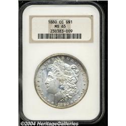 <B>1880-CC<S$1> MS65 NGC.</B></I> Both sides of this smooth, satiny Gem are at least partially framed in dappled golden-orange toning. <BR><BR><B>Important notice:</B> Heritage usually auctions material at the rate of 200-250 lots per hour. On some occasions eBay Live bid software or the Internet may not be able to keep up with the pace of the auction. We recommend placing a realistic absentee bid now as insurance to avoid disappointment. Occasionally the auctioneer may eliminate or reject an eBay Live bid, and the auctioneer may also reopen a lot after the close of the eBay live bidding (usually because we missed an audience bid), and may reject your bid even if it shows you as the winning bidder. By bidding via eBay Live, you agree that Heritage may award the lot to another bidder at its sole discretion under the circumstances described above or any other reasonable circumstances. Since eBay bids are not shown to us until we open the lot on the floor, we treat those bids just like floor bids. In most cases the floor responds before the eBay bid is presented to us, due to Internet lag time, so for consistency we have made it a policy that floor bids are always considered first over tie eBay live bids. Also please note that all Heritage lots purchased through eBay Live carry a 20% Buyer's Premium. Please make sure you read the Terms and Conditions before you bid.