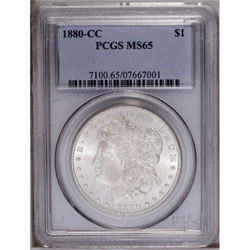 <B>1880-CC<img border='0' src='http://www.heritagecoins.com/images/star.gif' width=10 height=10>$1> MS65 PCGS.</B></I> A lovely dollar with frosty silver luster and no evidence of toning on either side. The obverse has a few grade-consistent abrasions, while the reverse is pristine. Graded separately, the reverse would garner at least one additional grade point. <BR><BR><B>Important notice:</B> Heritage usually auctions material at the rate of 200-250 lots per hour. On some occasions eBay Live bid software or the Internet may not be able to keep up with the pace of the auction. We recommend placing a realistic absentee bid now as insurance to avoid disappointment. Occasionally the auctioneer may eliminate or reject an eBay Live bid, and the auctioneer may also reopen a lot after the close of the eBay live bidding (usually because we missed an audience bid), and may reject your bid even if it shows you as the winning bidder. By bidding via eBay Live, you agree that Heritage may award the lot to another bidder at its sole discretion under the circumstances described above or any other reasonable circumstances. Since eBay bids are not shown to us until we open the lot on the floor, we treat those bids just like floor bids. In most cases the floor responds before the eBay bid is presented to us, due to Internet lag time, so for consistency we have made it a policy that floor bids are always considered first over tie eBay live bids. Also please note that all Heritage lots purchased through eBay Live carry a 20% Buyer's Premium. Please make sure you read the Terms and Conditions before you bid. This lot is being auctioned in conjunction with a live floor auction by Heritage Galleries & Auctioneers. All final auction and invoice information will be supplied by Heritage Galleries & Auctioneers, and all other information should be considered preliminary. Lot:3261 <BR><BR><B>Winning Notification and Billing:</B> After the FINAL session in this auction is complete, Heritage will send e-mail and snail mail invoices. This process normally takes several days. All final auction and invoice information will be supplied by Heritage Galleries & Auctioneers, and all other information should be considered preliminary. <BR><BR>This auction will be conducted on a live auction floor and over the Internet through eBay Live. If you choose to place an absentee bid, please take a moment to <font color='#0000ff'><u><a href='http://pages.ebay.com/liveauctions/help/before/laabsentee.html'>learn how eBay Live absentee bidding works</a></u></font><font color='#000000'>