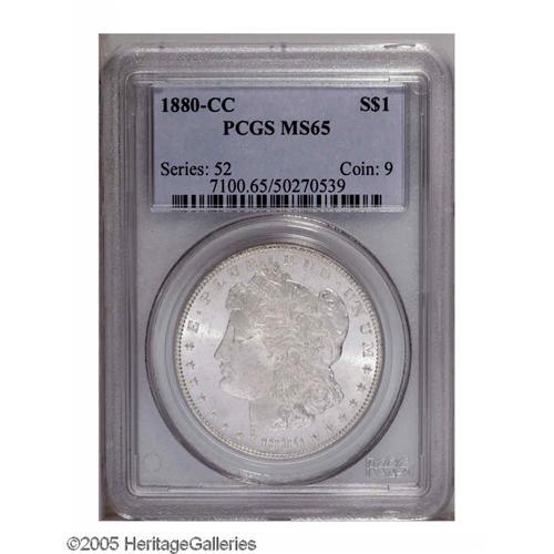 <B>1880-CC<S$1> MS65 PCGS.</B></I> Frosted motifs stand out against partially prooflike fields on this essentially untoned CC-Mint Gem. The design features are well impressed, with just the hair over Liberty's ear displaying traces of softness.