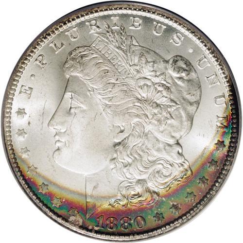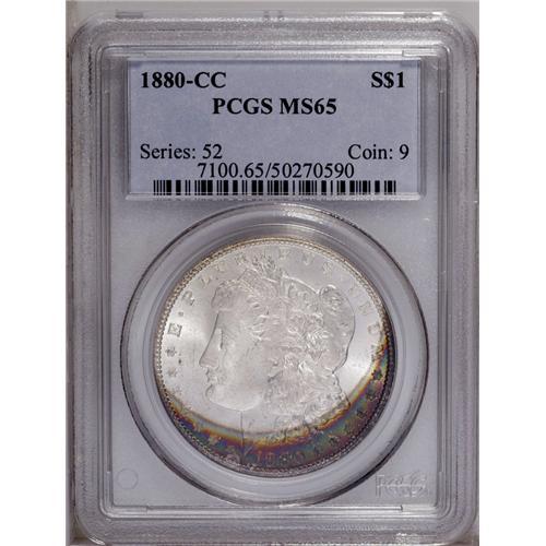 <B>1880-CC<img border='0' src='http://www.heritagecoins.com/images/star.gif' width=10 height=10>$1> MS65 PCGS.</B></I> Frosty surfaces are essentially white, save for an arc of deep multicolored toning along the lower obverse border. Central weakness is apparent in the hair over Liberty's ear and on the eagle's breast. There are no mentionable marks.