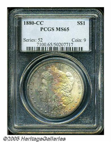 <B>1880-CC<S$1> MS65 PCGS.</B></I> Lustrous surfaces of this CC issue offer crescents of gold, crimson, green, and magenta patination on the obverse, while the reverse reveals speckles of light gold color. Except for weakness in the hair over Liberty's ear, the design elements are well brought up. A few minor scuffs and handling marks on Liberty's cheek are concealed within the toning.