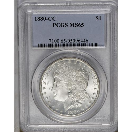 <B>1880-CC<img border='0' src='http://www.heritagecoins.com/images/star.gif' width=10 height=10>$1> MS65 PCGS.</B></I> There is a dash below the second 8 in the date. Lustrous and fully brilliant, each side presents a soft, satiny appearance. Somewhat softly struck in the centers, but otherwise beautifully preserved.