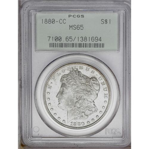 <B>1880-CC<img border='0' src='http://www.heritagecoins.com/images/star.gif' width=10 height=10>$1> MS65 PCGS.</B></I> This delicately toned and lustrous Gem has an above average strike. The fields are close to pristine, and only a few faint grazes are found on the cheek. Encased in an old green label holder.