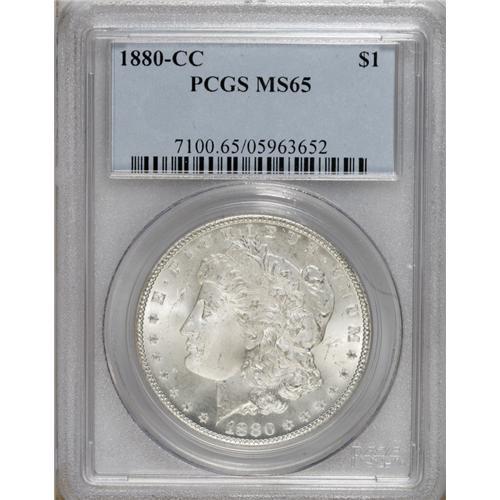 <B>1880-CC S$1 MS65 PCGS.</B></I> VAM-3. A dash lurks just beneath the second 8 in the date. Both Cs in the mintmark are filled by die chips. A lovely Gem with a layer of opaque silver patina across each side. Slightly soft in the centers, but otherwise well detailed and nicely preserved. Highly attractive.<BR><BR><b>Shipping:</b> Coins & Currency (<a target="_blank" href="http://www.heritageauctions.com/common/shipping.php">view shipping information</a>)