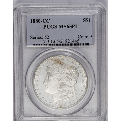 <B>1880-CC<img border='0' src='http://www.heritagecoins.com/images/star.gif' width=10 height=10>$1> MS65 Prooflike PCGS.</B></I> A flashy coin with moderately mirrored fields and good frost on the devices. Slightly hazy with two spots of brick-red toning on the obverse, one at 6 o'clock, the other at 12.