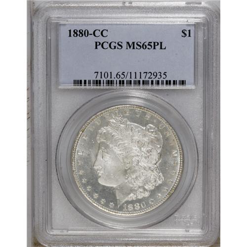 <B>1880-CC<img border='0' src='http://www.heritagecoins.com/images/star.gif' width=10 height=10>$1> MS65 Prooflike PCGS.</B></I> The fields are bright and nicely mirrored with significant mint luster over the devices for contrast. Visible abrasions are few on this example of an issue that is generally well produced, as seen here. PCGS has graded only seven examples of this issue finer (9/06).