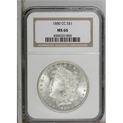 <B>1880-CC S$1 MS66 NGC.</B></I> This 1880-CC is the variety with the Reverse of 1879 with slanted top arrow feather. David Bowers (2005) writes that many of these coins are extensively bagmarked. This Premium Gem, however, displays gorgeous, radiantly lustrous surfaces that are devoid of mentionable marks. Adequately struck, except for weakness in the hair over Liberty's ear. Both sides are essentially untoned.<BR><BR><b>Shipping:</b> Coins & Currency (<a target="_blank" href="http://www.heritageauctions.com/common/shipping.php">view shipping information</a>)