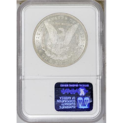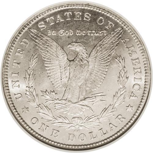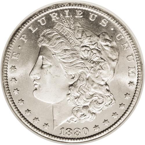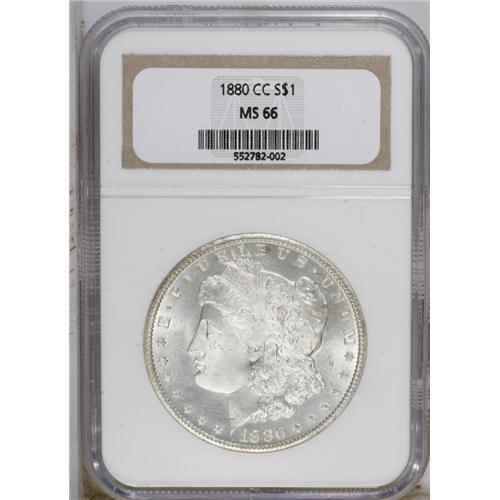 <B>1880-CC<img border='0' src='http://www.heritagecoins.com/images/star.gif' width=10 height=10>$1> MS66 NGC.</B></I> VAM-6. 8/7 Low, CC Dots. The first 8 in the date is repunched over a 7, which shows beneath. Tiny dots of extra metal show inside each C in the mintmark, which is small, and the arrow feathers are slanted (Reverse of 1879). This lovely Premium Gem is untoned, with brilliant mint luster, well-mirrored fields, and thick frost on the devices. NGC has graded 11 pieces finer (9/06).