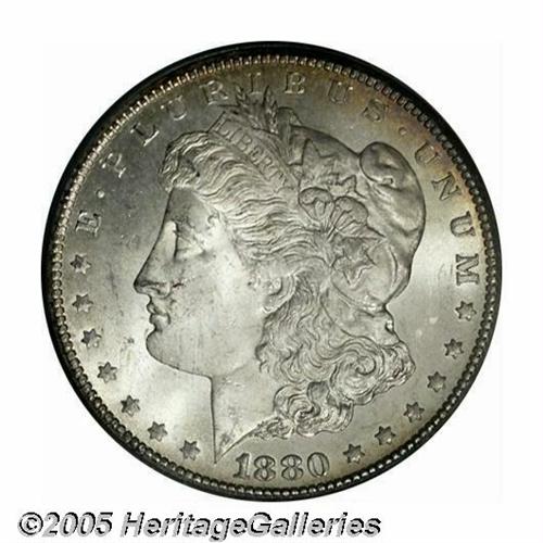 <B>1880-CC<S$1> MS66 PCGS.</B></I> A popular Carson City issue with only 591,000 pieces minted, this is an especially lustrous example whose only flaws are a couple of luster grazes on the face of Liberty. Light golden toning on the obverse, the reverse displays bands of deep iridescence over that entire side. A bit softly struck in the centers.