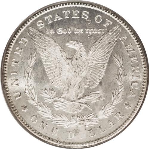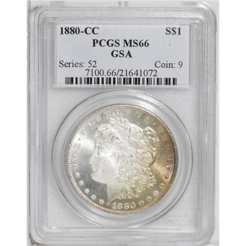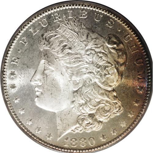<B>1880-CC<img border='0' src='http://www.heritagecoins.com/images/star.gif' width=10 height=10>$1> MS66 PCGS.</B></I> Ex: GSA. Gold, rose-red, and aqua-blue toning endows the right obverse margin. The reverse has numerous tiny autumn-brown dashes. Potent luster illuminates this attractively preserved Premium Gem. The obverse field is particularly clean. The strike is good, although the hair above the ear has minor blurring of detail.