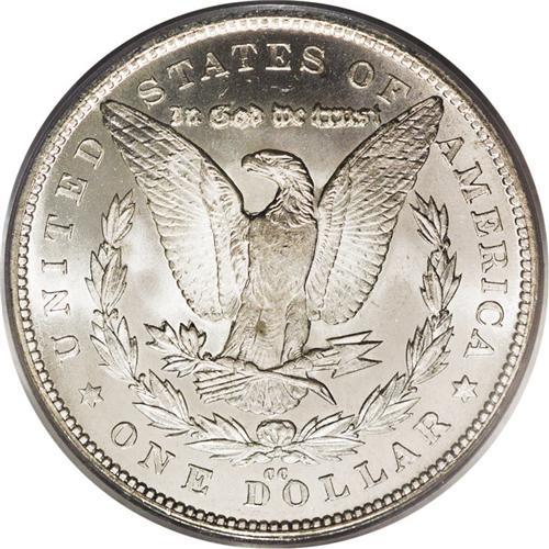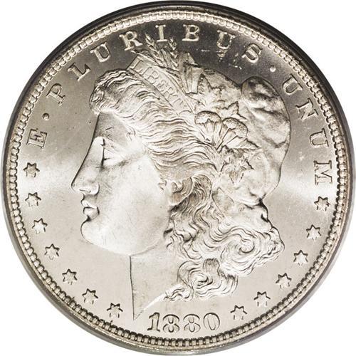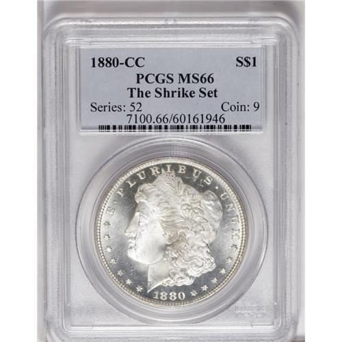 <B>1880-CC<img border='0' src='http://www.heritagecoins.com/images/star.gif' width=10 height=10>$1> MS66 PCGS.</B></I> Ex: The Shrike Set. The flashy fields are seemingly worthy of a Prooflike designation, but this lustrous and well preserved Carson City dollar will have to settle for the lofty (and fully merited) MS66 grade. A hint of softness on the hair above the ear is typical for the date.
