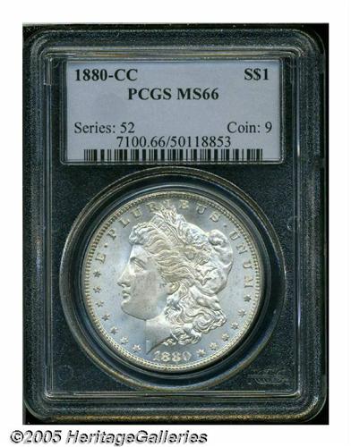 <B>1880-CC<S$1> MS66 PCGS.</B></I> Superb frosted mint luster and a minimum of surface marks for this often abraded issue. Natural molten silver surfaces with an untoned appearance overall.