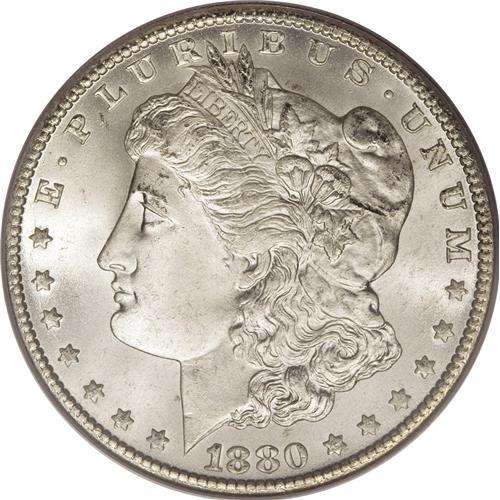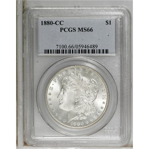 <B>1880-CC S$1 MS66 PCGS.</B></I> This variety has tiny die chips filling parts of the interior space in each C of the mintmark. The surfaces are frosty and fully brilliant with white-silver color and no evidence of toning. Close examination reveals some fine rolling marks on each side, parallel and identical in orientation between the two coins. PCGS has certified just 23 finer pieces (4/07).<BR><BR><b>Shipping:</b> Coins & Currency (<a target="_blank" href="http://www.heritageauctions.com/common/shipping.php">view shipping information</a>)