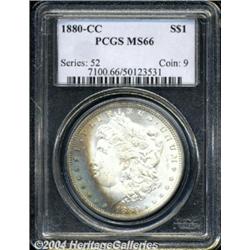 <B>1880-CC<S$1> MS66 PCGS.</B></I> Smooth and fully original with a crescent of deep cobalt-blue and golden-brown patina overlaying the left portion of the obverse. Well defined throughout, the remainder of the surfaces exhibit a frosty, untoned appearance. <BR><BR><B>Important notice:</B> Heritage usually auctions material at the rate of 200-250 lots per hour. On some occasions eBay Live bid software or the Internet may not be able to keep up with the pace of the auction. We recommend placing a realistic absentee bid now as insurance to avoid disappointment. Occasionally the auctioneer may eliminate or reject an eBay Live bid, and the auctioneer may also reopen a lot after the close of the eBay live bidding (usually because we missed an audience bid), and may reject your bid even if it shows you as the winning bidder. By bidding via eBay Live, you agree that Heritage may award the lot to another bidder at its sole discretion under the circumstances described above or any other reasonable circumstances. Since eBay bids are not shown to us until we open the lot on the floor, we treat those bids just like floor bids. In most cases the floor responds before the eBay bid is presented to us, due to Internet lag time, so for consistency we have made it a policy that floor bids are always considered first over tie eBay live bids. Also please note that all Heritage lots purchased through eBay Live carry a 20% Buyer's Premium. Please make sure you read the Terms and Conditions before you bid. </span></font></tr></table></td></tr></table>