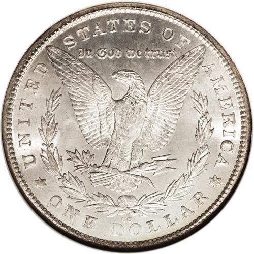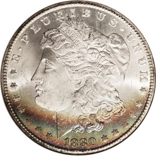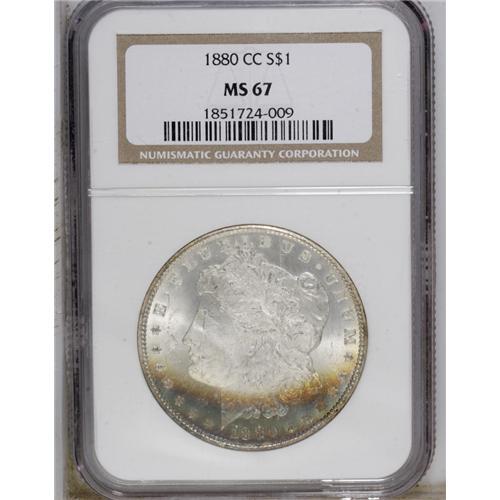<B>1880-CC<img border='0' src='http://www.heritagecoins.com/images/star.gif' width=10 height=10>$1> MS67 NGC.</B></I> The 1880-CC is a Carson City dollar that has even more appeal than other common dates from this mint. The mintage is impressively low with just over half a million pieces struck, a large percentage of the original mintage exists today in Uncirculated condition, there are two reverse types, and overdates are plentiful. The 1880-CC was available from the Treasury on an occasional basis from 1938 until the late 1970s. These last coins are the GSA holdings and most likely account for this coin. While purely speculation, we base that statement on the presence of the wide arc of sea-green and russet toning at the bottom of the obverse of this coin. The GSA coins were in canvas bags in the Treasury Department for many years and a substantial number of them acquired "bag toning" from decades-long exposure to the sulphur in the canvas bag. As an interesting sidenote, such "tarnished" coins were deemed by the GSA as circulated and actually sold at a significant discount over their all-brilliant counterparts.<BR> This piece is extraordinarily clean for a CC dollar with no mentionable marks on either side. Brilliant aside from the above-mentioned arc of toning. The highpoints are not quite fully struck, and close examination with a magnifier shows faint evidence of roller marks in these areas which is quite unusual on a Carson City dollar. A magnifier also shows the presence of a 7 beneath the second 8 in the date. Census: 11 in 67, 0 finer (9/06).