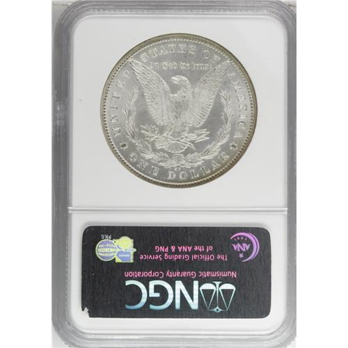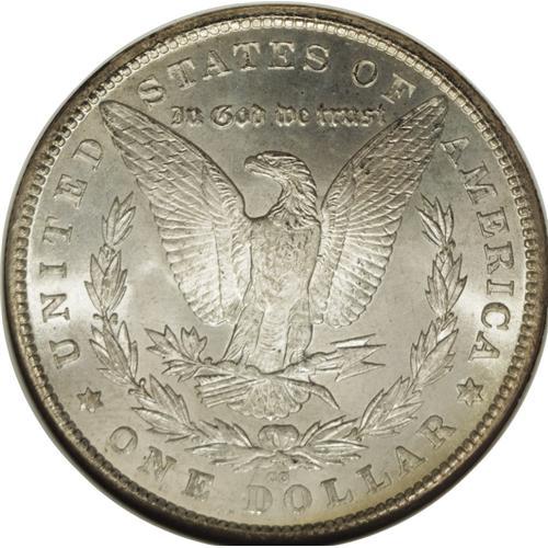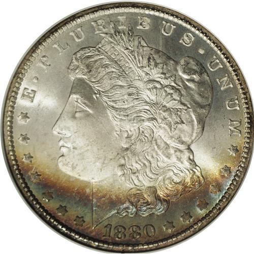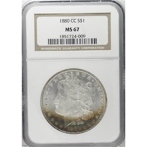 <B>1880-CC S$1 MS67 NGC.</B></I> The 1880-CC is a Carson City dollar that has even more appeal than other common dates from this mint. The mintage is impressively low with close to 600,000 pieces struck. In February 1881, the Assay Commission determined that a number of these were of insufficient silver fineness, and 96,000 were subsequently melted at the Mint, leaving a net production figure of 495,000 coins. The 1880-CC was available from the Treasury on an occasional basis from 1938 until the late 1970s. These last coins are the GSA holdings and most likely account for this coin. While purely speculation, we base that statement on the presence of the wide arc of sea-green and russet toning at the bottom of the obverse of this coin. The GSA coins were in canvas bags in the Treasury Department for many years and a substantial number of them acquired "bag toning" from decades-long exposure to the sulphur in the canvas bag.<BR> This piece is extraordinarily clean for a CC dollar with no mentionable marks on either side. Brilliant aside from the above-mentioned arc of toning. The hair over Liberty's ear is not quite fully struck, and close examination with a magnifier shows faint evidence of roller marks in these areas which is quite unusual on a Carson City dollar. A magnifier also shows the presence of a 7 beneath the second 8 in the date. Census: 11 in 67, 0 finer (11/06).<BR><BR><b>Shipping:</b> Coin/Currency (<a target="_blank" href="http://www.heritageauctions.com/common/shipping.php">view shipping information</a>)