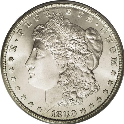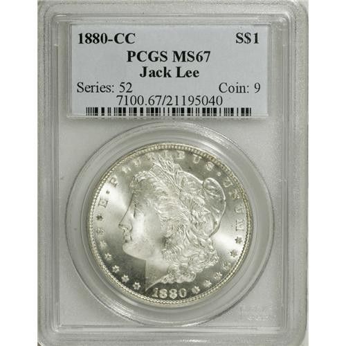 <B>1880-CC S$1 MS67 PCGS.</B></I> Ex: Jack Lee. Numerous varieties of this date exist, including the present variety with a small bar beneath the second 8 in the date. This variety is related to the overdate varieties of the year, although no other overdate features are visible. More important than its variety status is that this coin is tied for the finest certified by PCGS. The surfaces are pristine and brilliant with no marks on either side, other than a few of the tiniest ticks in the fields. It is a typical strike for the issue, with slightly weak hair details over Liberty's ear, but with all other design elements boldly rendered. Both sides have bold frosty luster and are fully white, save for the faintest evidence of gold toning on the eagle's sharply defined breast. Population: 23 in 67, 0 finer (2/07).<BR><I>From The Jackson Hole Collection.</B></I><BR><BR><b>Shipping:</b> Coins & Currency (<a target="_blank" href="http://www.heritageauctions.com/common/shipping.php">view shipping information</a>)