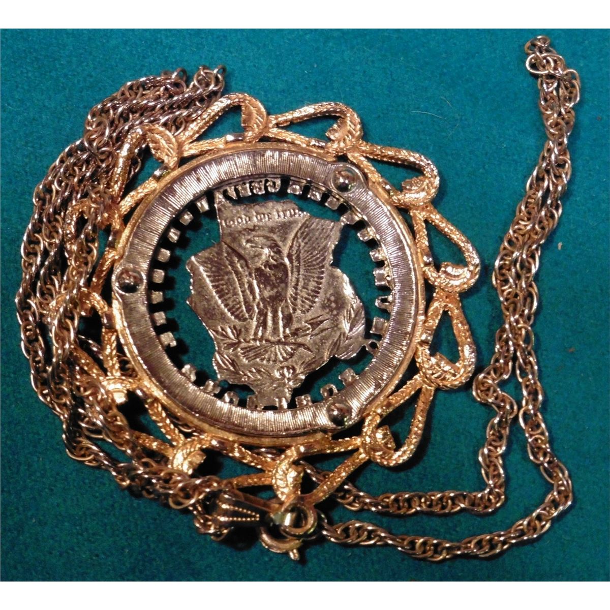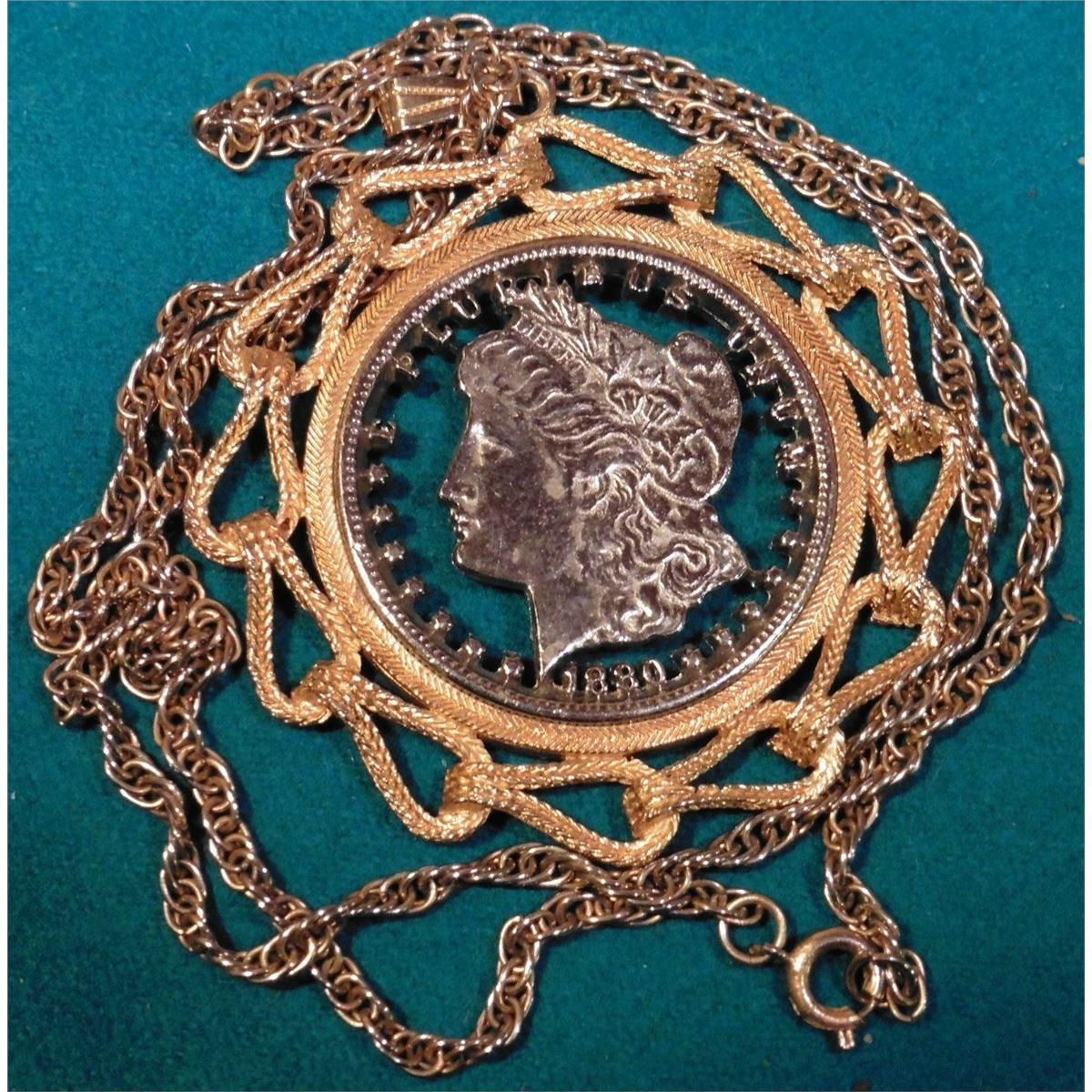 1880 Cut-out Morgan Silver Dollar in fancy bezel and suspended from a gold-plated chain.