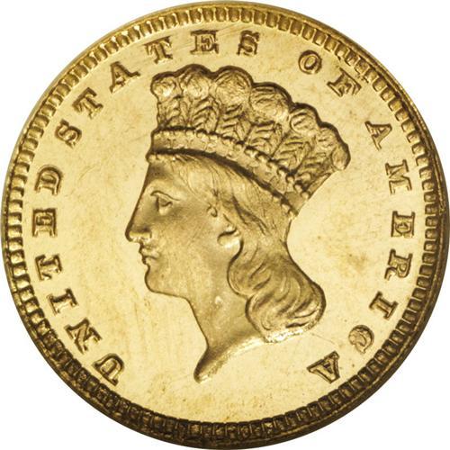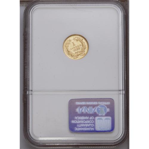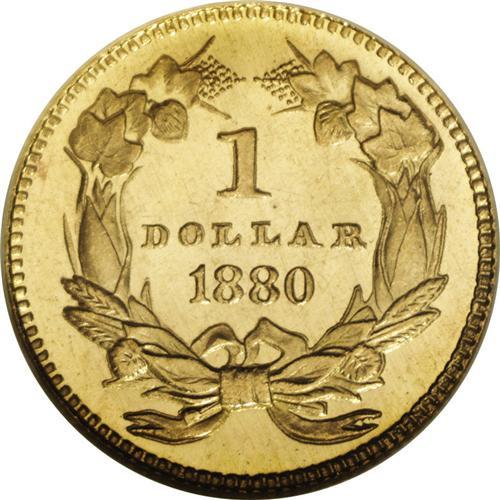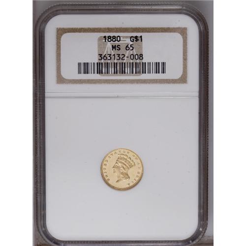 <B>1880 G$1 MS65 NGC.</B></I> Light in color with distinctive prooflike qualities, being more noticeably striated across the reverse. While a heavily hoarded issue, this issue's brief production of just 1,636 business strikes has long made it a favorite of collectors.