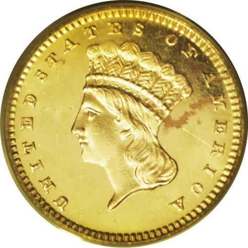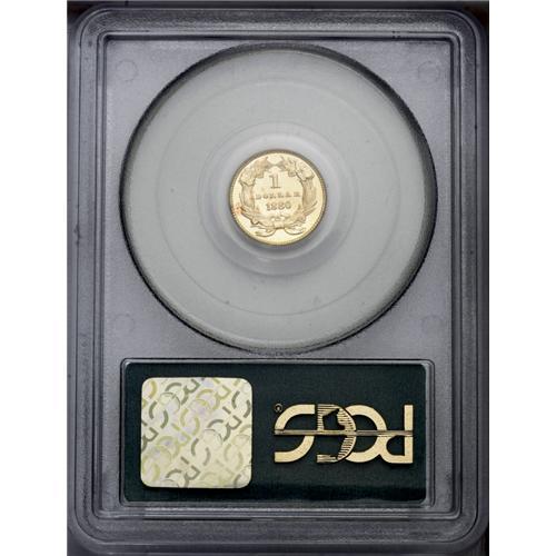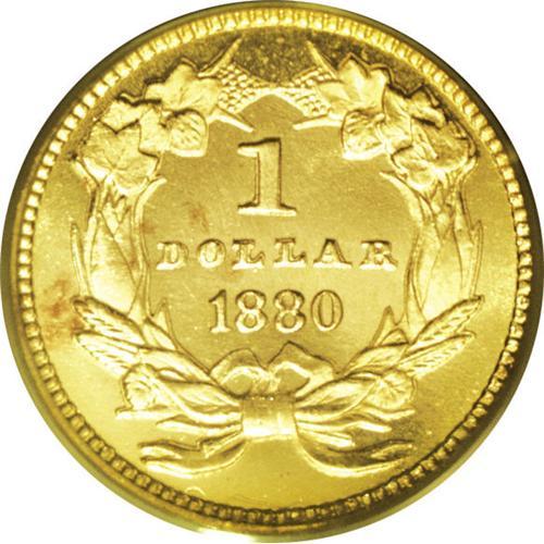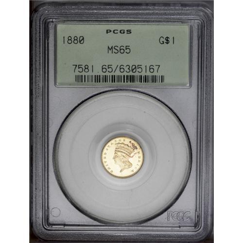 <B>1880<G$1> MS65 PCGS.</B></I> An elegant Gem strike of this low-mintage (yet widely hoarded) gold dollar, with prooflike, deeply mirrored fields, frosty devices, and superb black-on-gold contrast. Walter Breen's proof <I>Encyclopedia</B></I> hilariously comments of this date, "The coins of this date are enough to give a conscientious cataloguer or authenticator nightmares, ulcer attacks and premature gray hair. Proofs and many business strikes come from brilliantly polished dies on polished blanks!" He further describes the characteristics of genuine business strikes, which this coin shows, including die file marks at ATES and the top serif of 1 in the date below the adjacent leaf tip. Certified in a green-label holder.<BR><I>From The New York Eye Appeal Collection.</B></I>