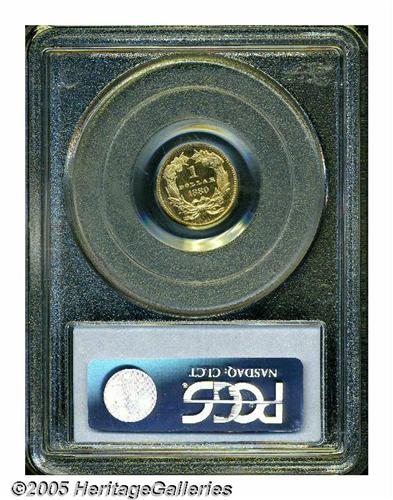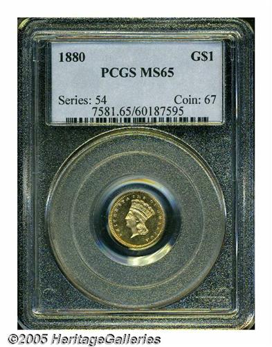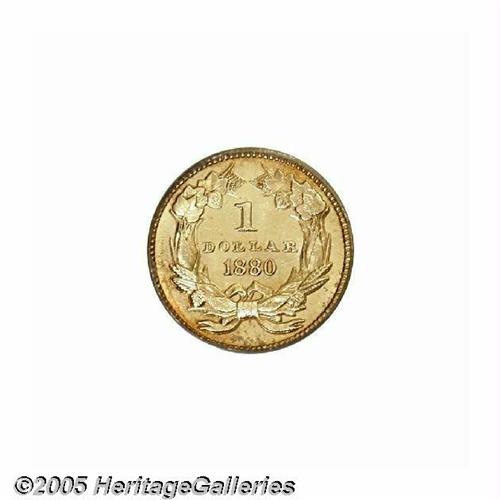 <B>1880<G$1> MS65 PCGS.</B></I> The 1880 Gold Dollar was widely hoarded at the time of issue with the result that high quality Mint State survivors are relatively available compared to many earlier dates in this series. However, the allure of an issue with a business strike mintage of just 1,600 coins has long made it a favorite with collectors. This flashy representative displays characteristic prooflike qualities in the fields and is coated in attractive orange-gold patina. The design elements are sharply impressed, and there are no mentionable contact marks to report.