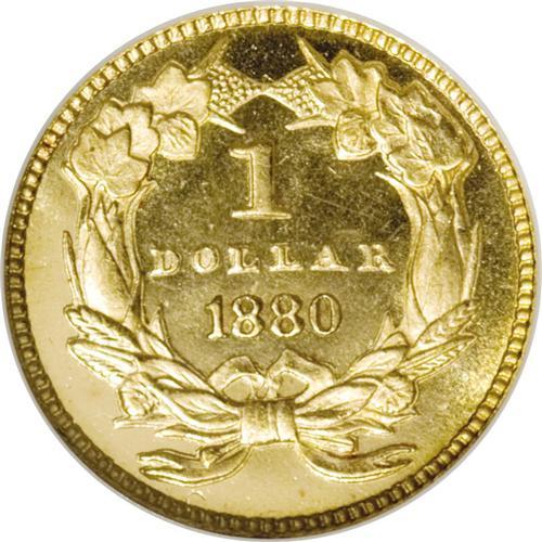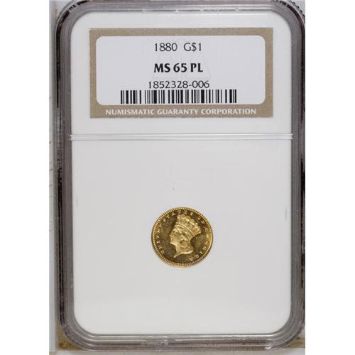 <B>1880 G$1 MS65 Prooflike NGC.</B></I> The 1880 gold dollar has always been a popular issue, primarily because of its low mintage of only 1,600 pieces. However, it has also been an extensively hoarded date because of the same low mintage. As a result, a higher percentage of this date has survived, and there are also a significant number of Gem and better coins known today. Because of the low mintage, many coins show the original flash from the polished fields. In the past, this has made distinguishing legitimate proofs from prooflike business strikes difficult. This coin has that mirrored reflectivity in the fields, and one can easily see how the novice might be confused. The devices are fully struck throughout and there are no mentionable abrasions on either side.<BR><BR><b>Shipping:</b> Coin/Currency (<a target="_blank" href="http://www.heritageauctions.com/common/shipping.php">view shipping information</a>)
