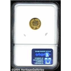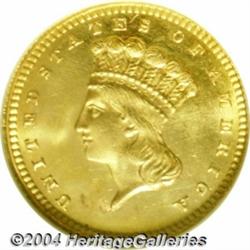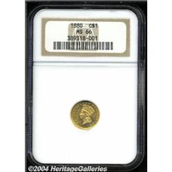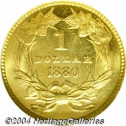 <B>1880<G$1> MS66 NGC.</B></I> Original honey-gold patina graces the bright fields of this needle-sharp and rather prooflike premium Gem. By 1880, the Mint had long given up large-scale production of the Gold Dollar denomination, and business strikes amounted to a token 1,600 pieces. Although a portion of the mintage appears to have been set aside by contemporary collectors, the 1880 is encountered substantially less often than later hoarded issues such as the 1889. <BR><BR><B>Important notice:</B> Heritage usually auctions material at the rate of 200-250 lots per hour. On some occasions eBay Live bid software or the Internet may not be able to keep up with the pace of the auction. We recommend placing a realistic absentee bid now as insurance to avoid disappointment. Occasionally the auctioneer may eliminate or reject an eBay Live bid, and the auctioneer may also reopen a lot after the close of the eBay live bidding (usually because we missed an audience bid), and may reject your bid even if it shows you as the winning bidder. By bidding via eBay Live, you agree that Heritage may award the lot to another bidder at its sole discretion under the circumstances described above or any other reasonable circumstances. Since eBay bids are not shown to us until we open the lot on the floor, we treat those bids just like floor bids. In most cases the floor responds before the eBay bid is presented to us, due to Internet lag time, so for consistency we have made it a policy that floor bids are always considered first over tie eBay live bids. Also please note that all Heritage lots purchased through eBay Live carry a 20% Buyer's Premium. Please make sure you read the Terms and Conditions before you bid. </span></font></tr></table></td></tr></table>