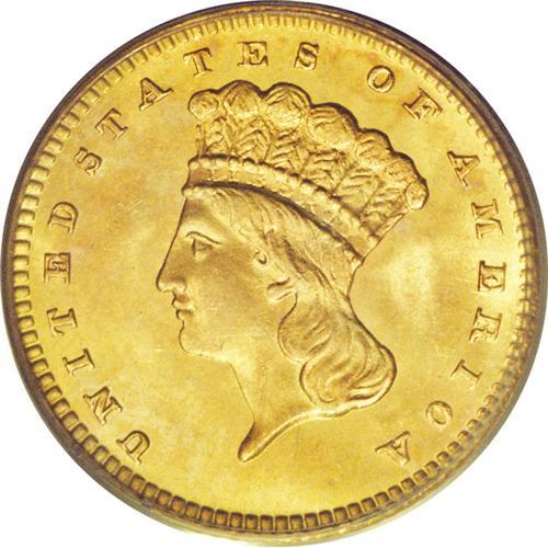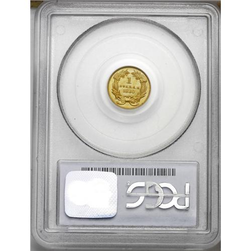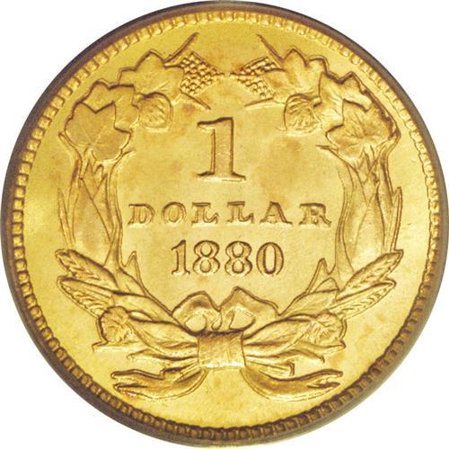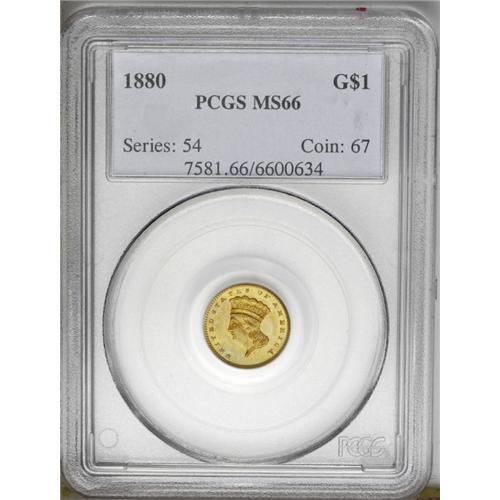 <B>1880<G$1> MS66 PCGS.</B></I> With an original mintage of only 1,600 business strikes, the 1880 gold dollar is an understandably scarce issue that becomes quite rare at the present level. This is a uniformly frosted Premium Gem whose surfaces show a mixture of yellow-gold and green-gold coloration with no grade-limiting distractions. The sharply struck design elements serve to further enhance the overall eye appeal of this Type Three Indian Head dollar.<BR><I>From The Chief Paduke Collection.</B></I>