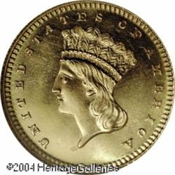 1880 G$1 MS66 Prooflike NGC. With its combination <B>1880 G$1 MS66 Prooflike NGC.</B></I> With its combination of MS66 quality and the scarcity suggested by an original mintage of only 1,600 pieces, this is sure to be a very popular item with both date and type collectors. The surfaces are bright and flashy with strong prooflike fields. The devices have a chiseled appearance that tells of the coin's complete striking definition. Some slight counterclockwise die rotation is also noted. <BR><BR><B>Important notice:</B> Heritage usually auctions material at the rate of 200-250 lots per hour. On some occasions eBay Live bid software or the Internet may not be able to keep up with the pace of the auction. We recommend placing a realistic absentee bid now as insurance to avoid disappointment. Occasionally the auctioneer may eliminate or reject an eBay Live bid, and the auctioneer may also reopen a lot after the close of the eBay live bidding (usually because we missed an audience bid), and may reject your bid even if it shows you as the winning bidder. By bidding via eBay Live, you agree that Heritage may award the lot to another bidder at its sole discretion under the circumstances described above or any other reasonable circumstances. Since eBay bids are not shown to us until we open the lot on the floor, we treat those bids just like floor bids. In most cases the floor responds before the eBay bid is presented to us, due to Internet lag time, so for consistency we have made it a policy that floor bids are always considered first over tie eBay live bids. Also please note that all Heritage lots purchased through eBay Live carry a 20% Buyer's Premium. Please make sure you read the Terms and Conditions before you bid. This lot is being auctioned in conjunction with a live floor auction by Heritage Galleries & Auctioneers. All final auction and invoice information will be supplied by Heritage Galleries & Auctioneers, and all other information should be considered preliminary. Lot:6473