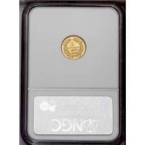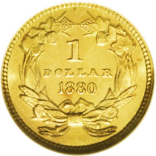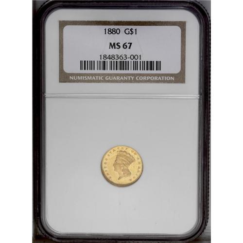 <B>1880<G$1> MS67 NGC.</B></I> This gorgeous Superb Gem features flashy fields and blushes of rich peach toning. The strike is penetrating, and the preservation is exceptional. A wonderful example of this ultra-low mintage issue. Just 1,600 business strikes were coined, in addition to 36 proofs. Only the 1856-D, the 1860-D, and the 1875 have lower mintages within the series.