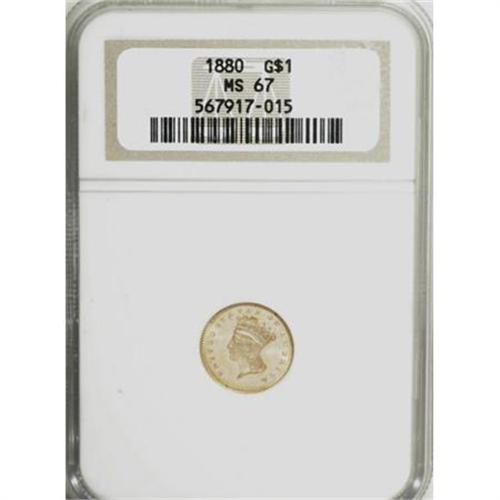 <B>1880 G$1 MS67 NGC.</B></I> A remarkably low-mintage issue, with a production of just 1,636 gold dollars, although few of these coins actually circulated. The result is a substantial Mint State population, but mostly in lower quality. Few examples surpass this lovely Superb Gem specimen. It is sharply struck with brilliant orange-gold surfaces and brilliant satin luster. Census: 78 in 67, 23 finer (12/07).<BR><BR><B>Coin Engraver:</B> James B. Longacre<BR><BR><b>Shipping:</b> Coins & Currency (<a target="_blank" href="http://www.heritageauctions.com/common/shipping.php">view shipping information</a>)
