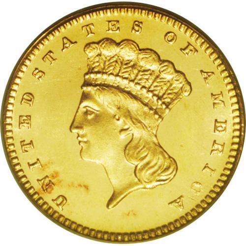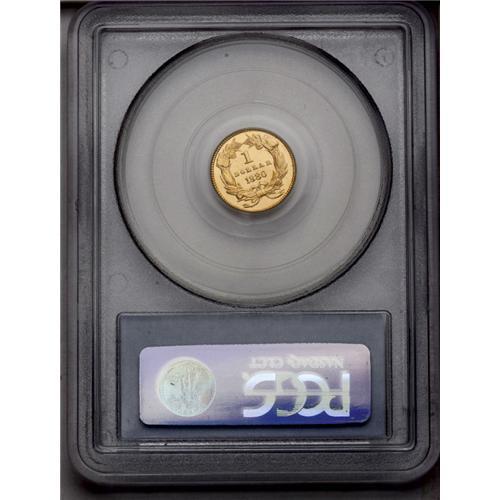 <B>1880<G$1> MS67 PCGS.</B></I> Always popular with collectors (and hoarders) because of its low mintage, the 1880 is also one of the few gold dollars that can be found occasionally as a Superb Gem. This is a radiant coin that has glowing mint luster that races around each side unimpeded by the small abrasions that usually populate the surfaces of gold dollars. Fully struck, there is just the slightest hint of reddish patina at the lower left portion of the obverse. About 25 degrees of counterclockwise die rotation is noted. Outstanding quality. Population: 94 in 67, 22 finer (4/06).